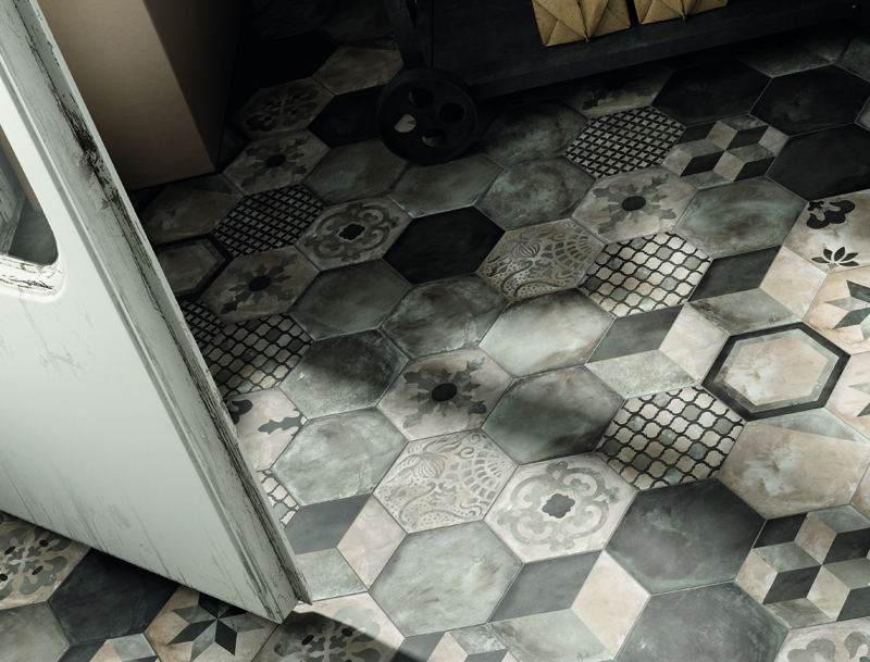 Reinterpreted for a modern aesthetic, Terra features a classic hexagon style with a modern concrete finish. Cool grey hues set a contemporary tone for this timeless tradition. Three cool shades including Anthracite, Grigio and Nero are stocked in 10″ hexagons. Coordinating decos are available special order from our US Depot in full cartons per style. Deco styles include Cubo, Cornice, Porzione, Rombo, Stella, Giglio, Floreale, Coloniale, Astro, Cardinale and Fiore.